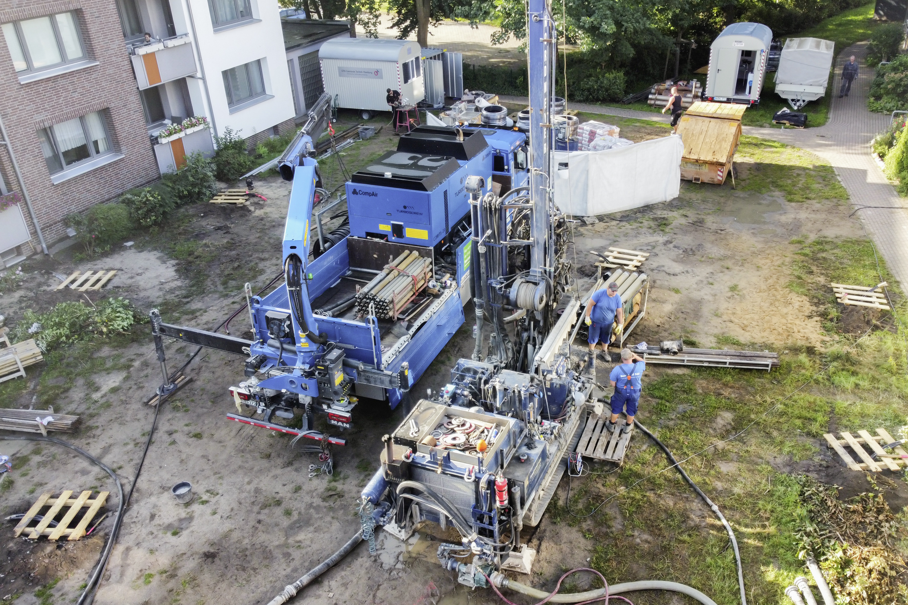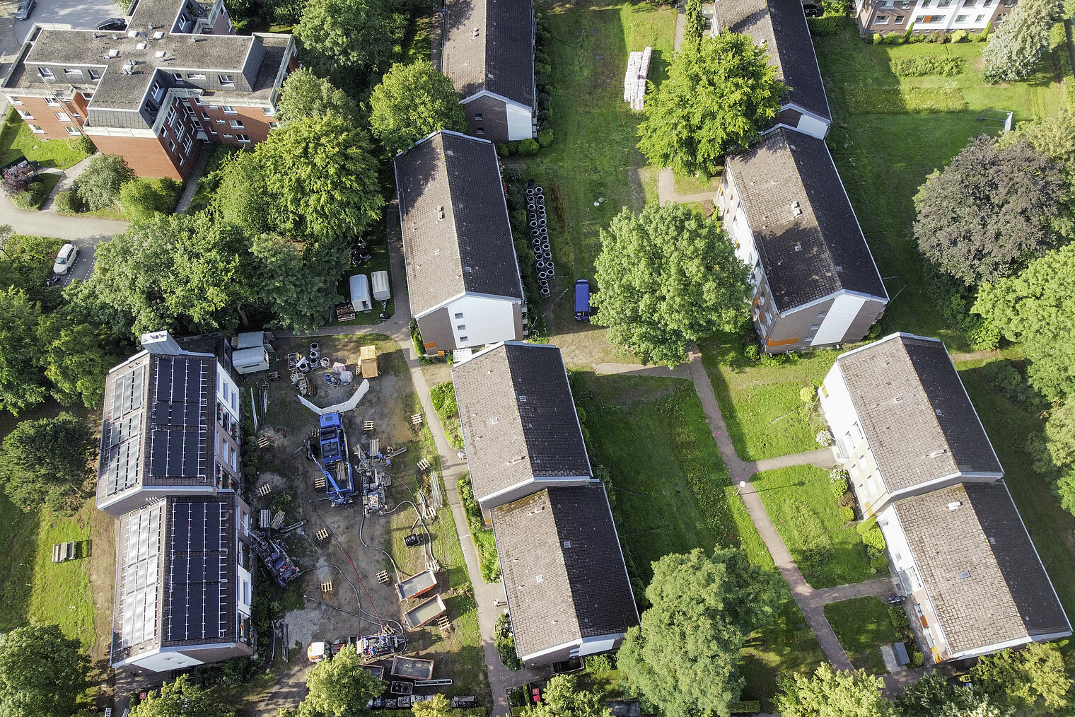 En 2023, la rénovation du système de chauffage était au programme dans le quartier résidentiel composé de neuf bâtiments, situé rue Billwerder/Billwiese. L’objectif principal était de remplacer la production de chaleur par des sources d’énergie renouvelables. Des forages tests réalisés par BauGrund Süd, filiale de Weishaupt, ont confirmé le potentiel géothermique du site.