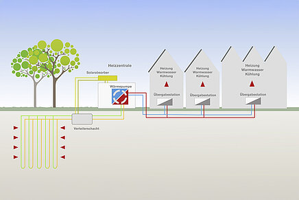Aujourd’hui, le quartier est alimenté par deux pompes à chaleur Eau glycolée /eau WWP S 90 ID et un stock tampon de 1000 litres. La source d’énergie est assurée par un champ de 42 sondes géothermiques, chacune d’une profondeur de 54 mètres, installé par BauGrund Süd. Pour répondre aux exigences réglementaires, un absorbeur solaire a été mis en place afin de régénérer les sondes, accompagné de trois points de mesure pour le suivi thermique.