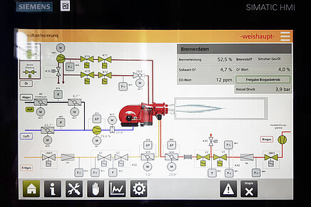 La livraison comprenait aussi le système de commande du brûleur, conçu et testé par Weishaupt, avec le manager de combustion numérique W-FM1000 CMS. La visualisation et le pilotage s’effectuent via un écran tactile intuitif.