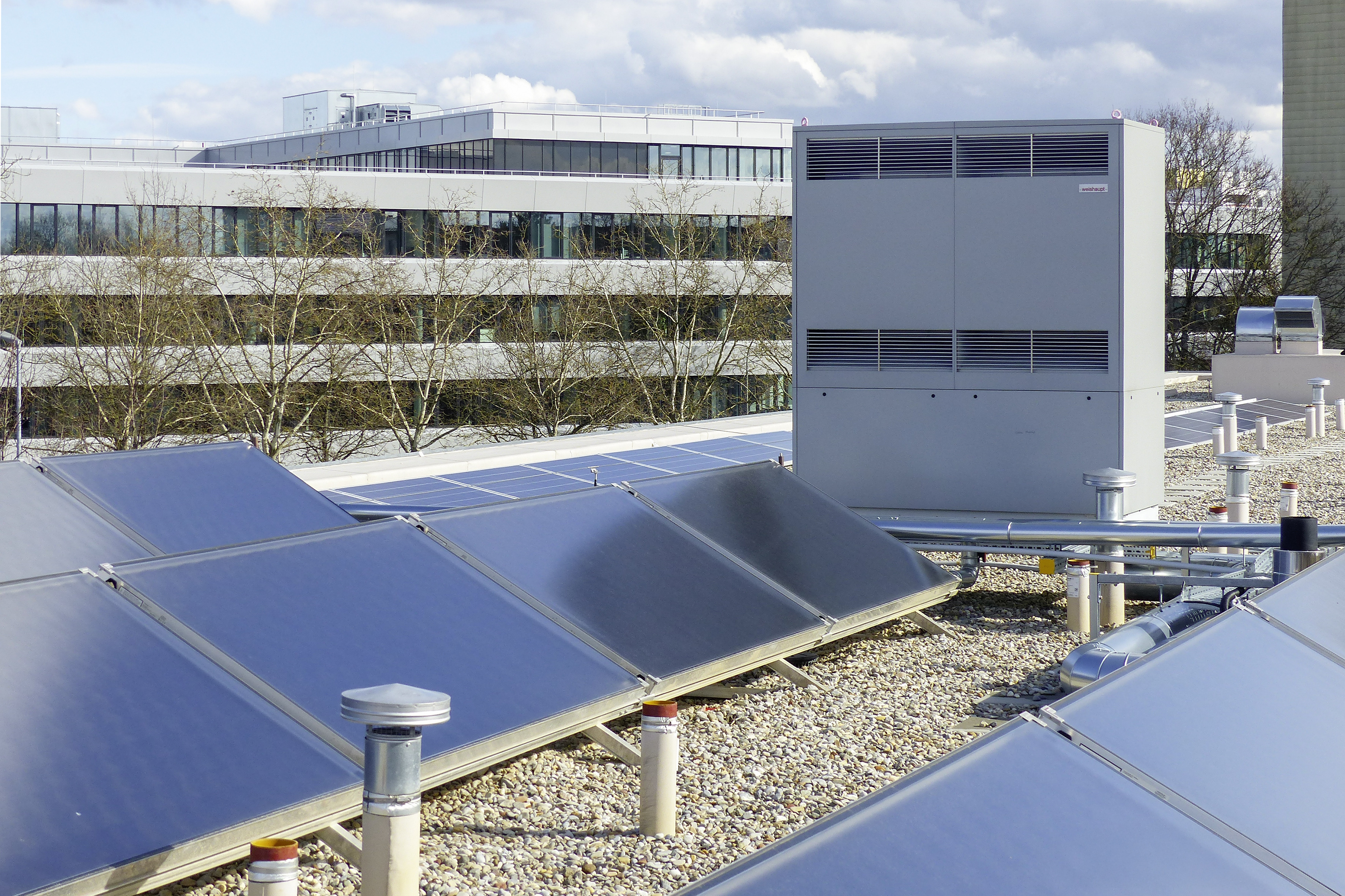 Pour le chauffage et la production d’eau chaude, l’établissement a opté pour un système hybride Weishaupt. Celui-ci comprend une pompe à chaleur air/eau WWP L 60 AD installée en extérieur, une chaudière à condensation gaz Thermo Condens® WTC-GB 210, 18 capteurs solaires WTS-F2 et deux stocks tampons de 3000 litres chacun.